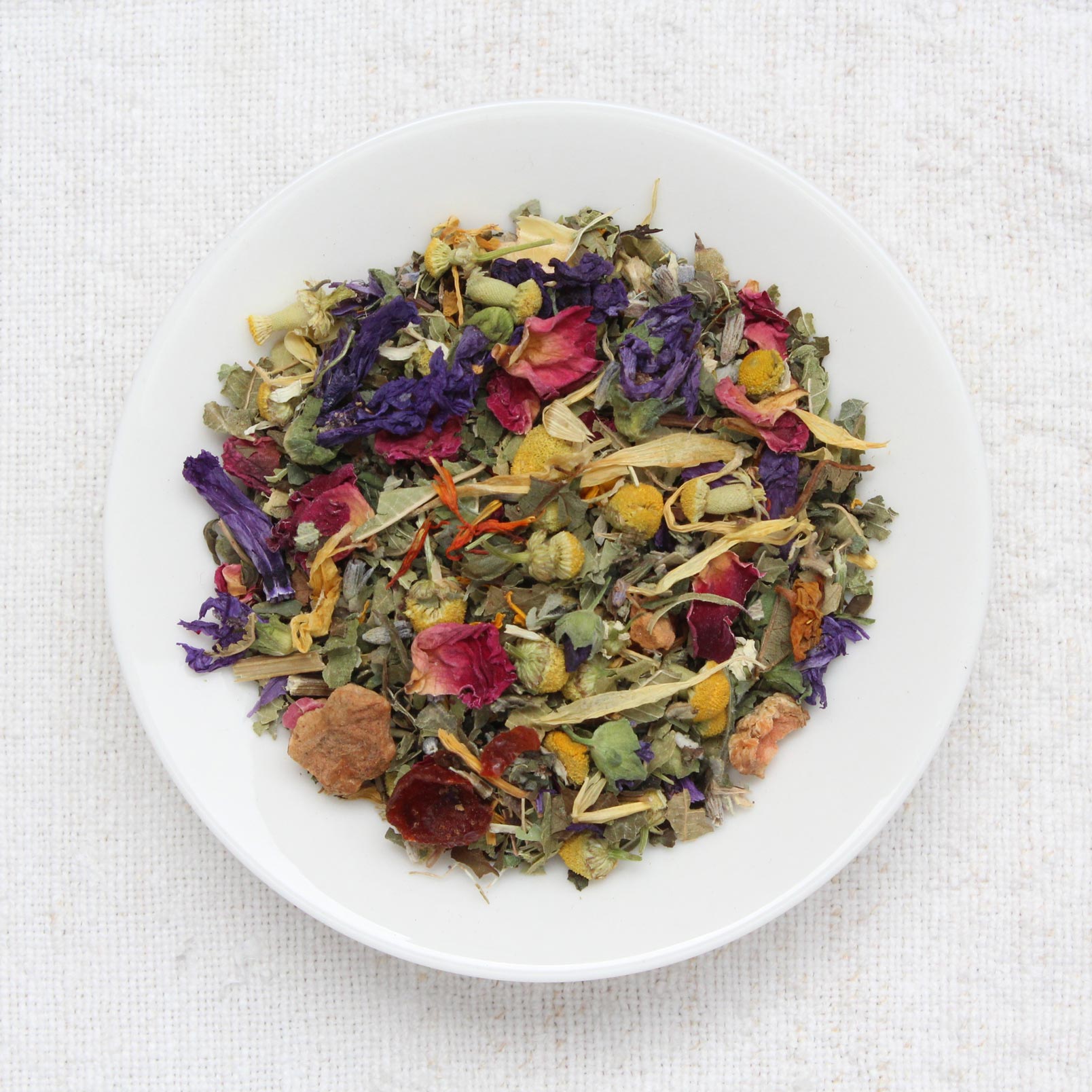 Zloženie: Medovka lekárska, verbena citrónová, mäta jabloňová, listy bobuľovitých plodov (listy černice, listy čiernych ríbezlí), šupky šípok, kúsky jabĺk, listy sladkej černice, kvety harmančeka, šalvia, kvety levandule, okvetné lístky slnečnice, kvety slezu, okvetné lístky pivonky, okvetné lístky nechtíka lekárskeho, okvetné lístky svetlice farbiarskeho.